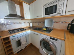 The kitchen is fully equipped with a washing machine and plenty of storage room.