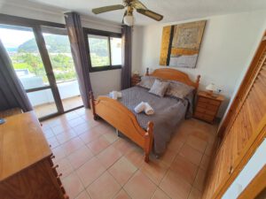The front bedroom has air conditioning, a ceiling fan and is furnished with a double bed, a built-in wardrobe, and a balcony to enjoy your morning coffee watching the sunrise.